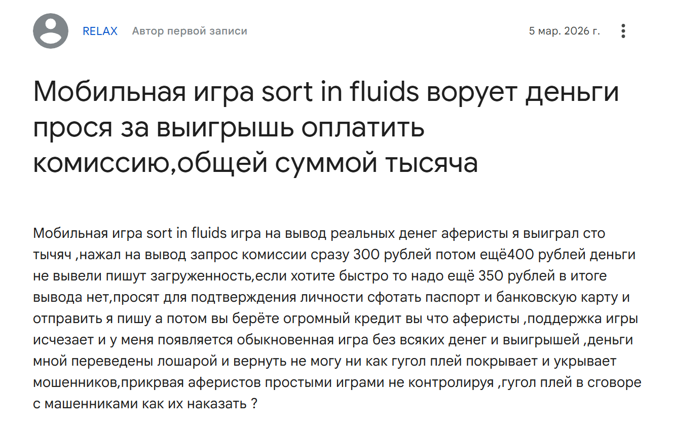 В реальных отзывах о Sort In Fluids клиенты жалуются на обман со стороны разработчиков. В них игроки рассказывают о способах выманивания денег и последствиях сотрудничества. Они рассказывают истории с указанием потерянной суммы.
