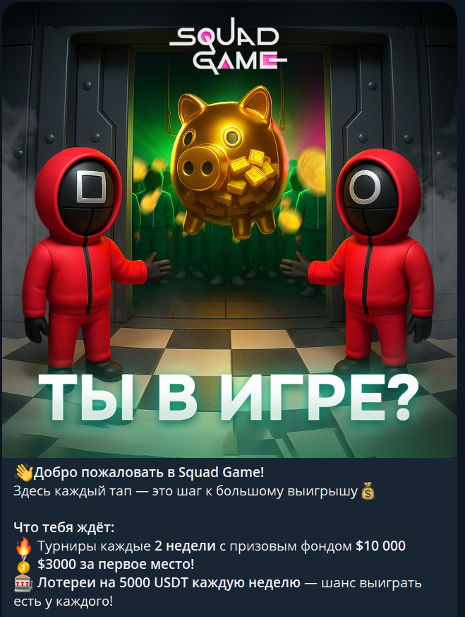 У игры нет своего отдельного токена, поэтому выплаты обещают начислять в USDT. Минимальный вывод должен быть от 100 долларов. Тут проводятся розыгрыши, призовой фонд которых может составлять 10 тысяч долларов. Создатели проекта телеграм-игры Squad game не раскрываются, поэтому игру можно считать анонимными.Как играть в Squad game