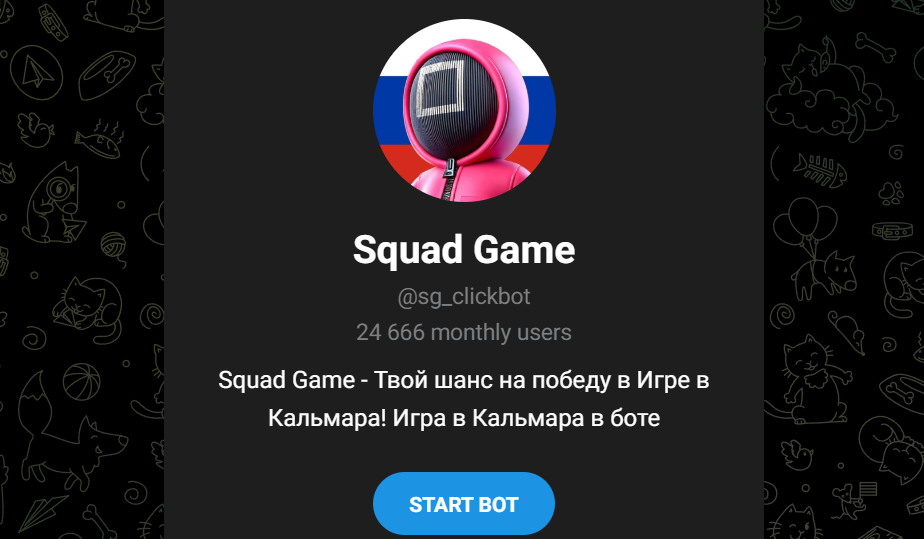 SG clickbot представляет собой игру-тапалку. Она построена на принципе tap to earn. Для того, чтобы зарабатывать в данной игре USDT, нужно выполнять такие простые действия, как тапание по экрану. Это позволяет увеличивать пассивный доход. Все оформлено в стиле сериала «Игра в кальмара». Кликать постоянно пользователи не смогут, так как им дается ограниченное количество энергии. Она обновляется каждые 3 часа. Чтобы получить больше энергии ТГ Squad game предлагает выполнять различные активности или покупать ее за реальную валюту.