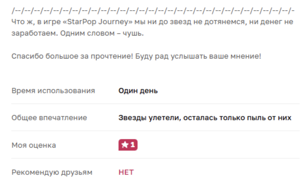 Так как в Play Market комментарии и оценки заблокированы, искать отзывы про Starpop Journey придется на сторонних источниках. Их достаточно много и практически все — отрицательные. Некоторые пользователи пишут целые разоблачения с подробным описанием схемы обмана. Они подтверждают, что вывести реальные деньги невозможно из-за того, что создатели искусно блокируют возможность накопления $500.