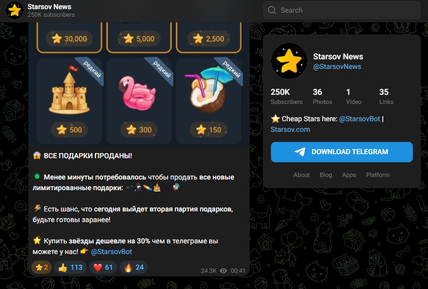 Для раскрутки и поддержания активности у проекта есть свой новостной канал – Starsov News (@StarsovNews). При этом на комьюнити подписано довольно немало народу – 250 тысяч фолловеров. В канале постят новости, анонсы и создают ажиотаж вокруг «лимитированных подарков» (их, кстати, можно купить за звезды). Все это админы делают, чтобы мотивировать подписчиков закупаться звездами именно через их бота. Для решения проблем есть отдельный аккаунт техподдержки – Starsov Support (@StarsovSupportNew).