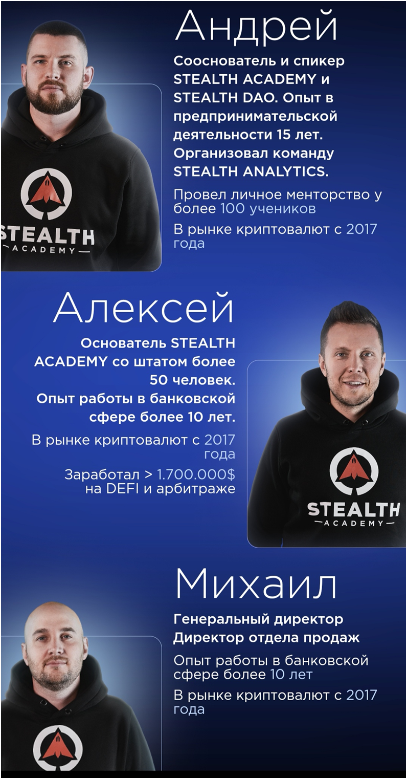 На сайте stealthacademy com указана статистика, что на данный момент больше 350 инвесторов обучаются, заработали уже больше 2 миллионов долларов. В команде участвуют предприниматели, специалисты в сфере IT и представители банковского сектора. Основная цель – совместное инвестирование с участниками фонда, ну и, собственно, помощь в развитии.