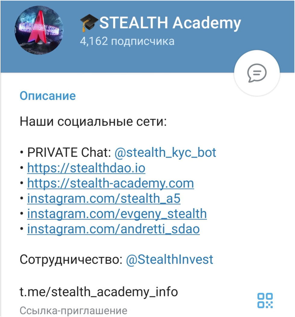 В паблике Телеграмм на сентябрь 2024 года насчитывается 4162 подписчика. Вовлеченность аудитории очень низкая. Всего лишь три реакции мы видим на последнем посте. В описании к каналу – контакты на аккаунты в Инстаграм stealth a5, evgeny stealth, andretti sdao. Это, видимо, члены команды. И они вполне успешны и известны. Например, Алексей Якунин собрал более 40 тысяч подписчиков. Также есть Stealth kyc bot, где при желании многие могут узнать информацию о сотрудничестве.