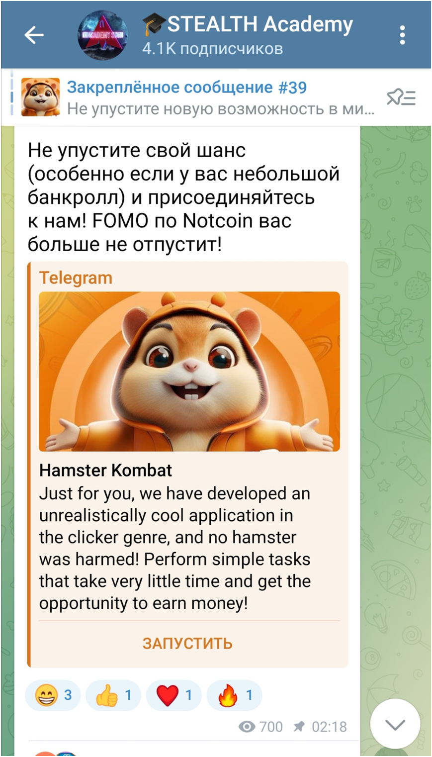 В Телеграмме есть 39 закрепленных сообщений. В том числе предлагается присоединиться к игре Hamster Kombat. Указана реферальная ссылка на игру.