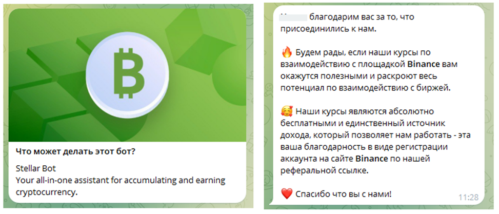 Назначение и возможности робота есть в чат-боте в Телеграмм. Перед запуском платформа сообщает, что выступает помощником для клиентов в вопросе накопления и заработка криптовалют. После нажатия на «старт» Stellar Tg Bot приветствует клиента и благодарит за его использование. В коротком ознакомительном посте сообщается, что проект предлагает курсы, связанные с работой на платформе Binance. Бот, вероятно, публикует контент, который помогает лучше разобраться в принципах устройства биржи.