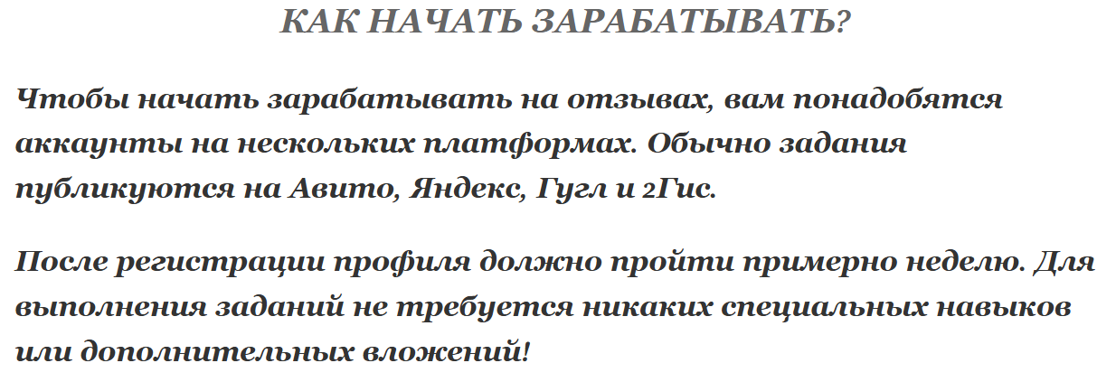 В основном организаторы проекта требовали размещать отзывы на сайтах Авито, Яндекс, Гугл и 2Гис. Чтобы приступить к выполнению заданий, пользователь должен был иметь прокачанный аккаунт на этих площадках.