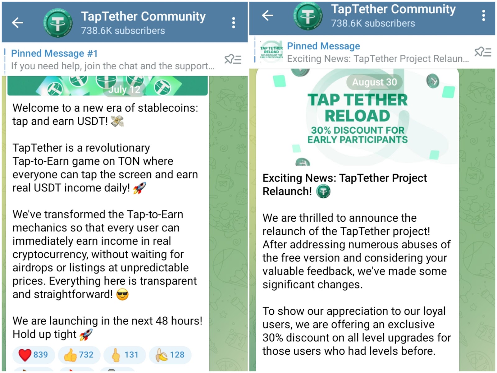 Для того чтобы следить за новостями, предлагают переходить в Telegram канал Taptether Community. На паблик Tap Tether Channel подписано 738k пользователей.