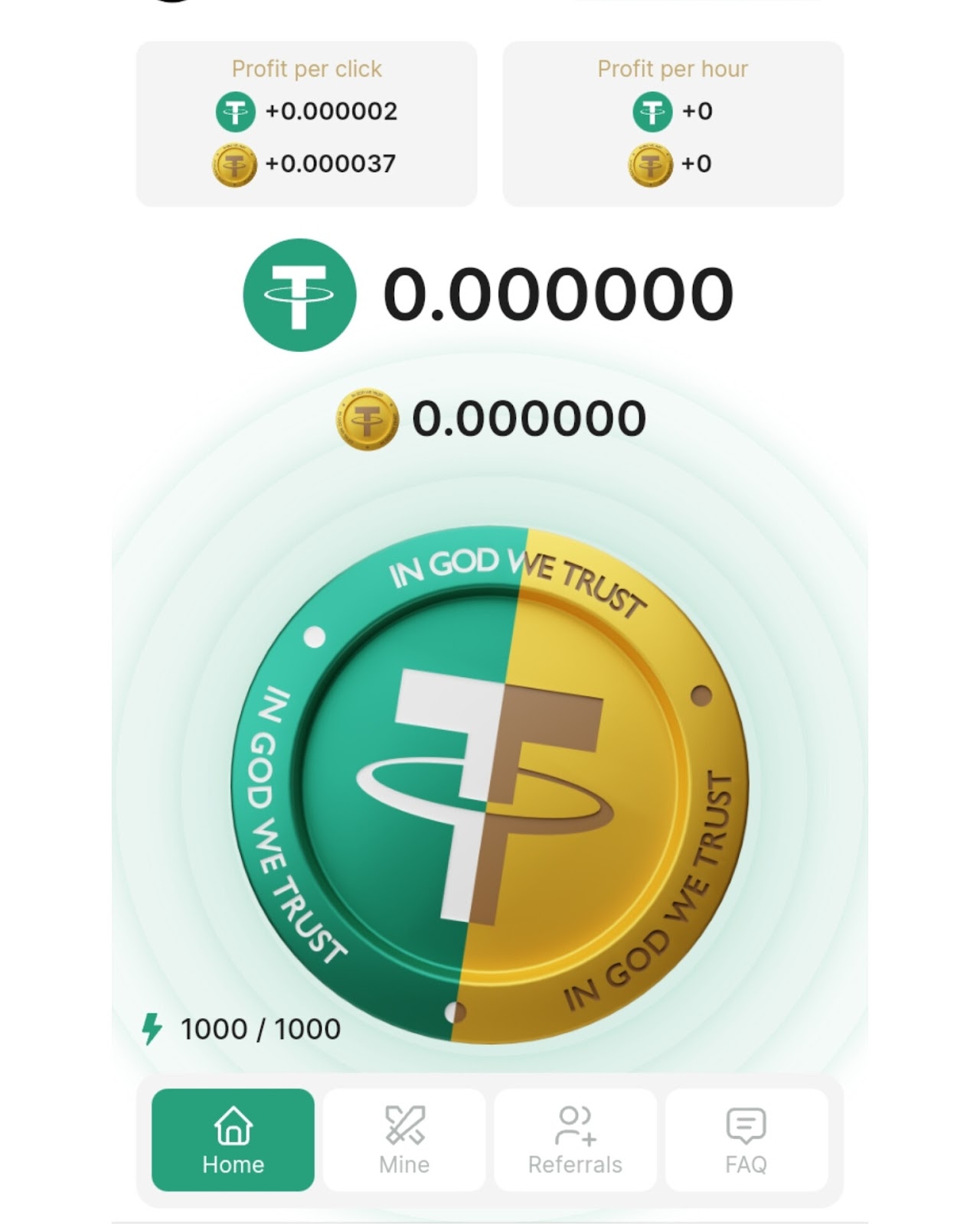 Как играть в Tap Tether bot? Для начала стоит нажать на бота с соответствующим названием. После запуска Телеграм бота, необходимо кликнуть на “Play Now”. Пользователь попадет в игровой аккаунт со следующими разделами: Home, Mine, Referrals, FAQ.