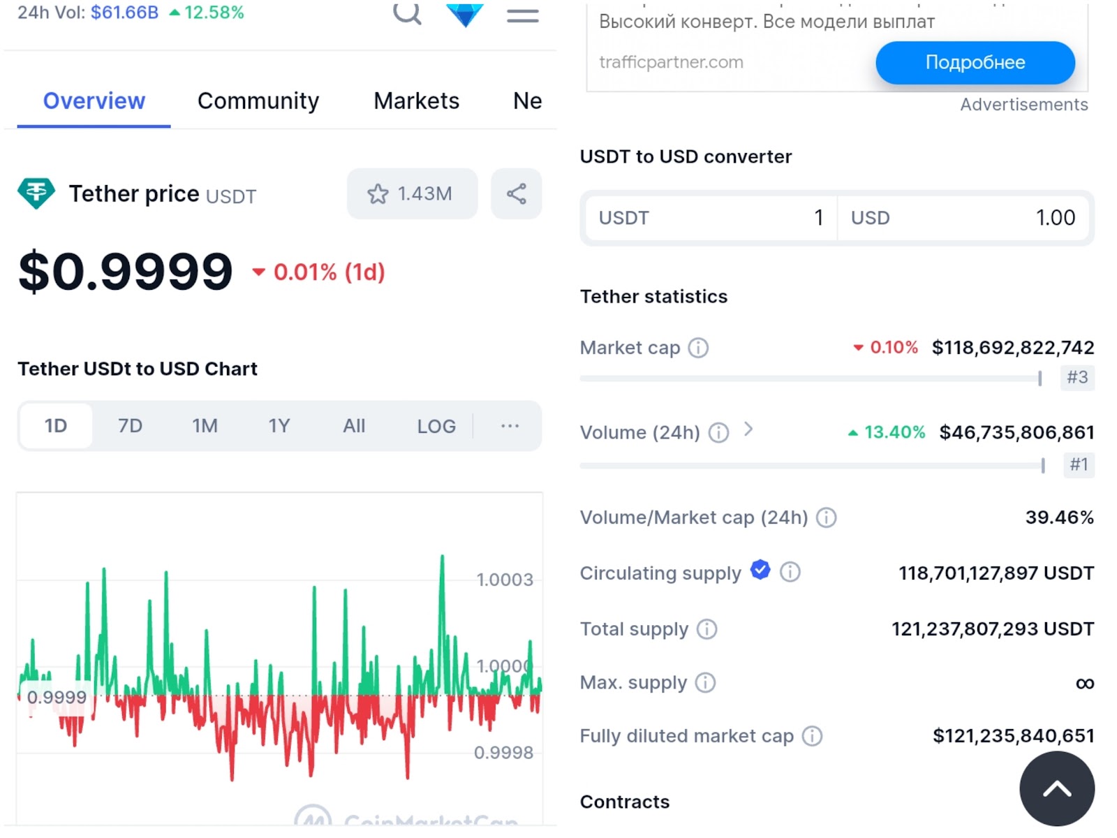 На данный момент курс токена USDT Taptether — приравнивается к 0,9999 долларам.