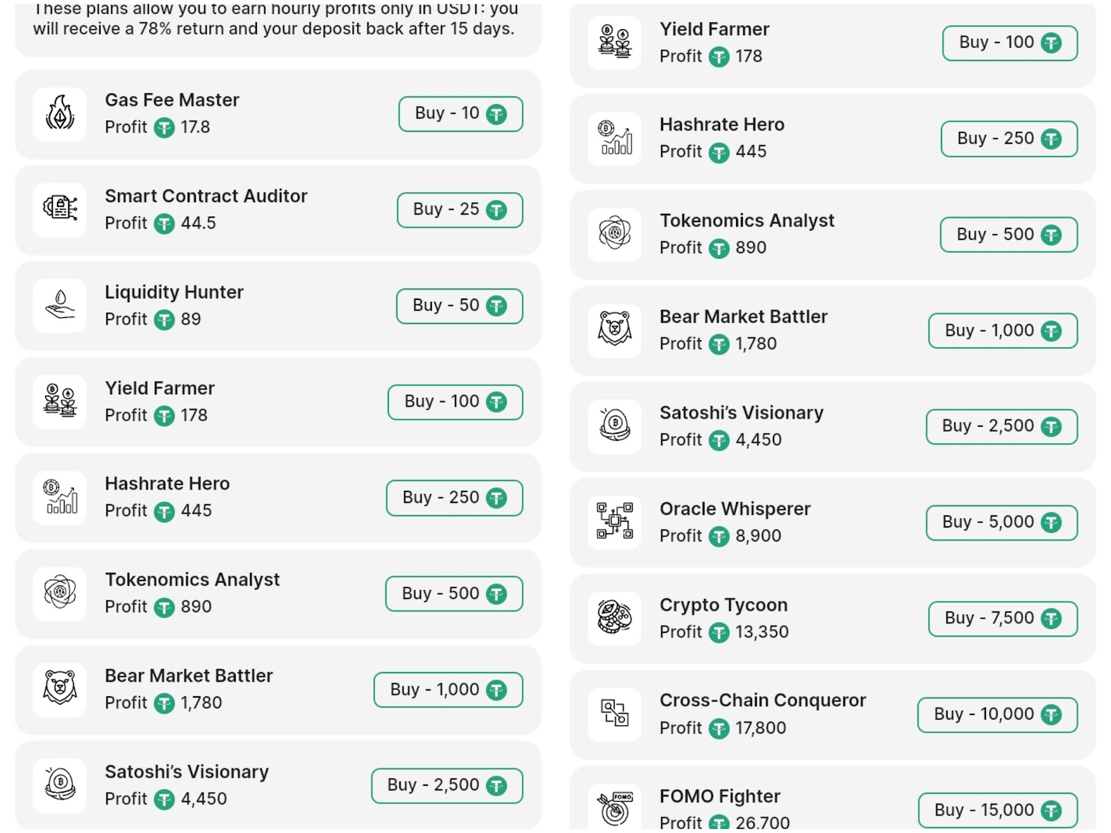 • Crypto Tycoon. Цена составляет 7 500 USDT. Пользователю будет начислено 13 350 USDT