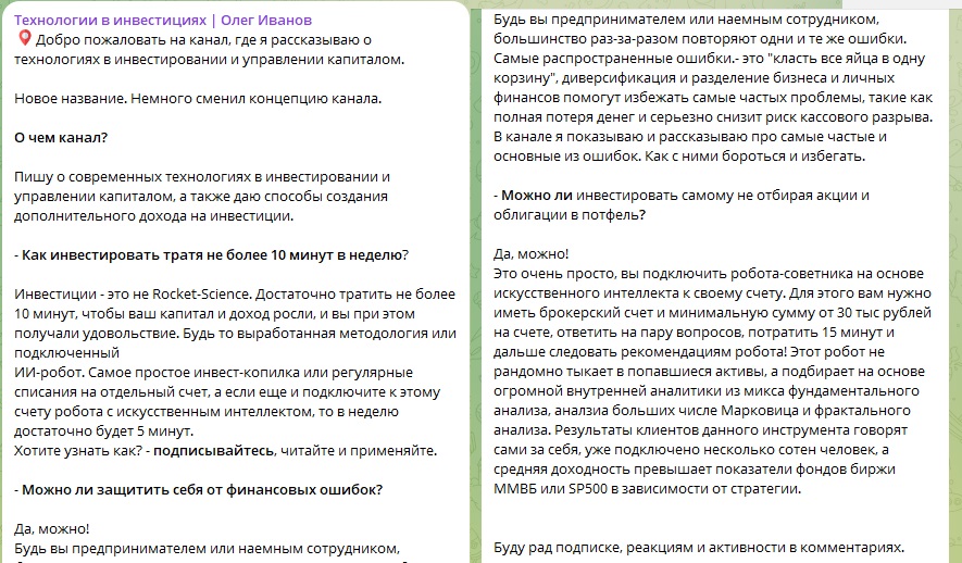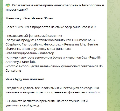Технологии в инвестициях Олег Иванов — Telegram-канал, где автор рассказывает о новых идеях по инвестированию, о тенденциях развития финансовых рынков, публикует материалы по обучению в инвестсфере. Что известно об Олеге Иванове и можно ли доверять его советам и рекомендациям, мы выясним в ходе очередного расследования.