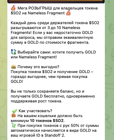 Чтобы дополнительно стимулировать интерес к инвестированию в $SO2, участникам сообщества предлагают 50% бонус к покупке токена. Эти деньги будут зачислены на баланс игрока в Stand Off 2.