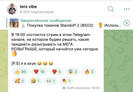 Предполагаем, что автор проекта «Терс Вайб» — это сотрудник компании, который продвигает продукты студии. Как утверждает сам Терс, он не проводил стримов уже около года. И есть подозрения, что вернулся он исключительно для того, чтобы повысить популярность токена StandOff2.