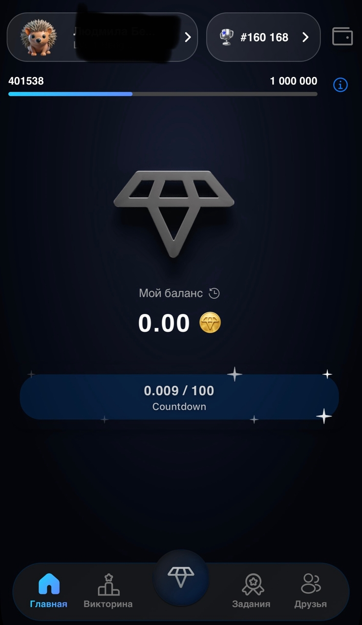На главном экране игры расположено изображение, похожее на логотип крипты TON. После запуска начинается автоматический фарминг. Постоянно кликать по экрану не нужно.