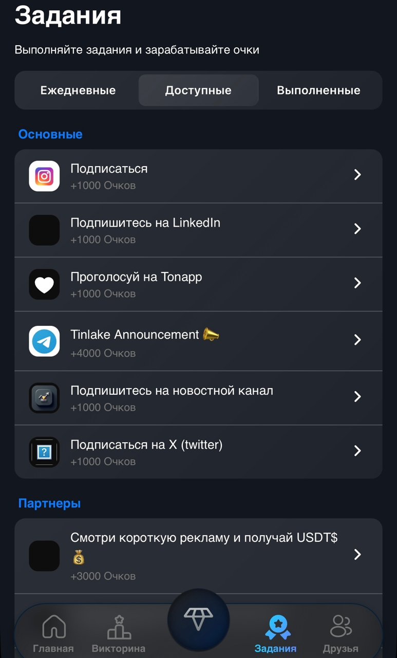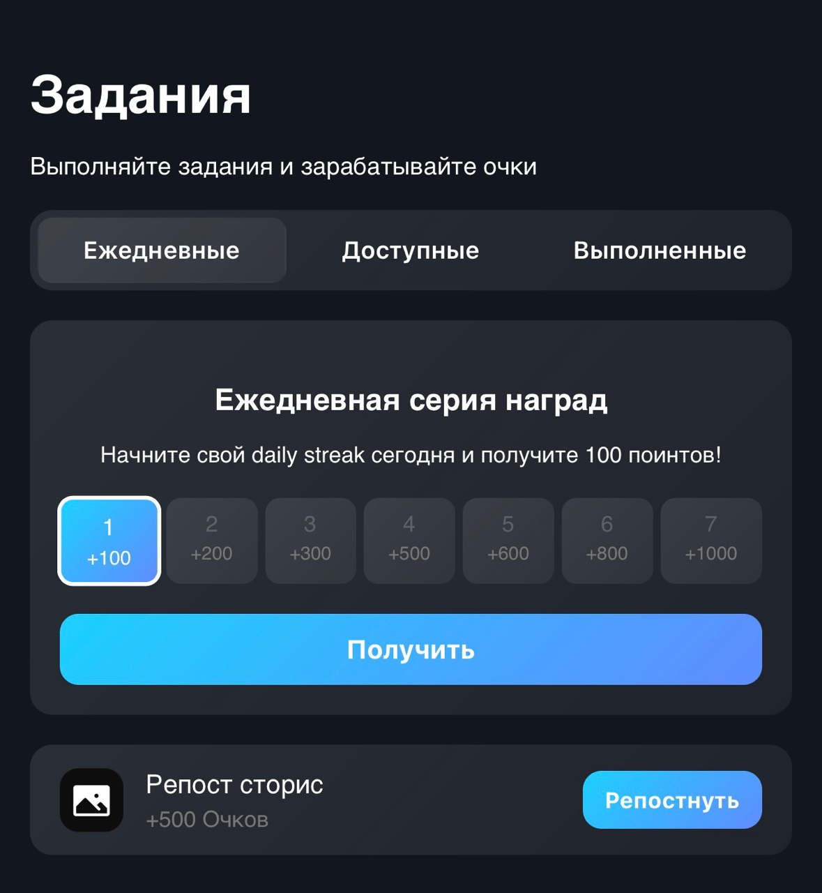 Предусмотрен и раздел с заданиями и бонусами. За ежедневный вход в игру начисляются бонусные монеты. Бонус увеличивается в геометрической прогрессии, то есть в первый день игрок получает 100 монет, во второй – 200 и т.д.Задания стандартные – подписаться на телеграм-каналы партнеров, аккаунты в Инстаграме. Перечень доступных заданий обновляется каждый день. Есть раздел со статистикой выполненных заданий.