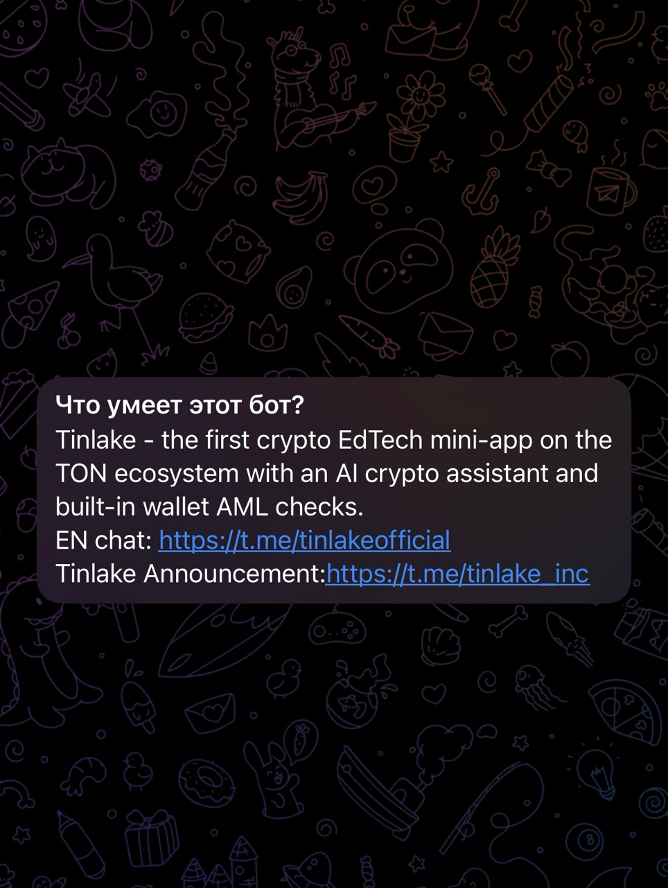 Принять участие в Tinlake можно совершенно бесплатно. В тг предусмотрен бот, через которого и открывается игровое мини-приложение. Бот работает на английском, но сама тапалка запускается на русском, автоматически определяя страну регистрации пользователя.