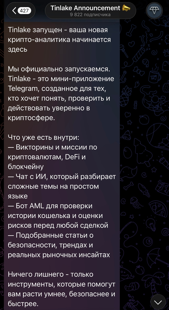 Tinlake – телеграм-проект, который начал свою работу весной 2025 года, за 10 месяцев существования информационный канал проекта набрал порядка 9800 пользователей. О создателях информации нет.