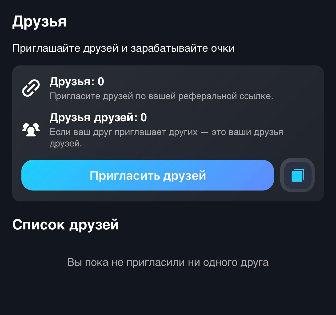 Предусмотрена и партнерская программа. Но размер вознаграждений по ней неизвестен. В разделе приложения «Друзья» можно лишь получить свою ссылку для приглашения.