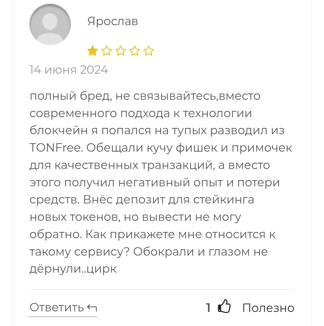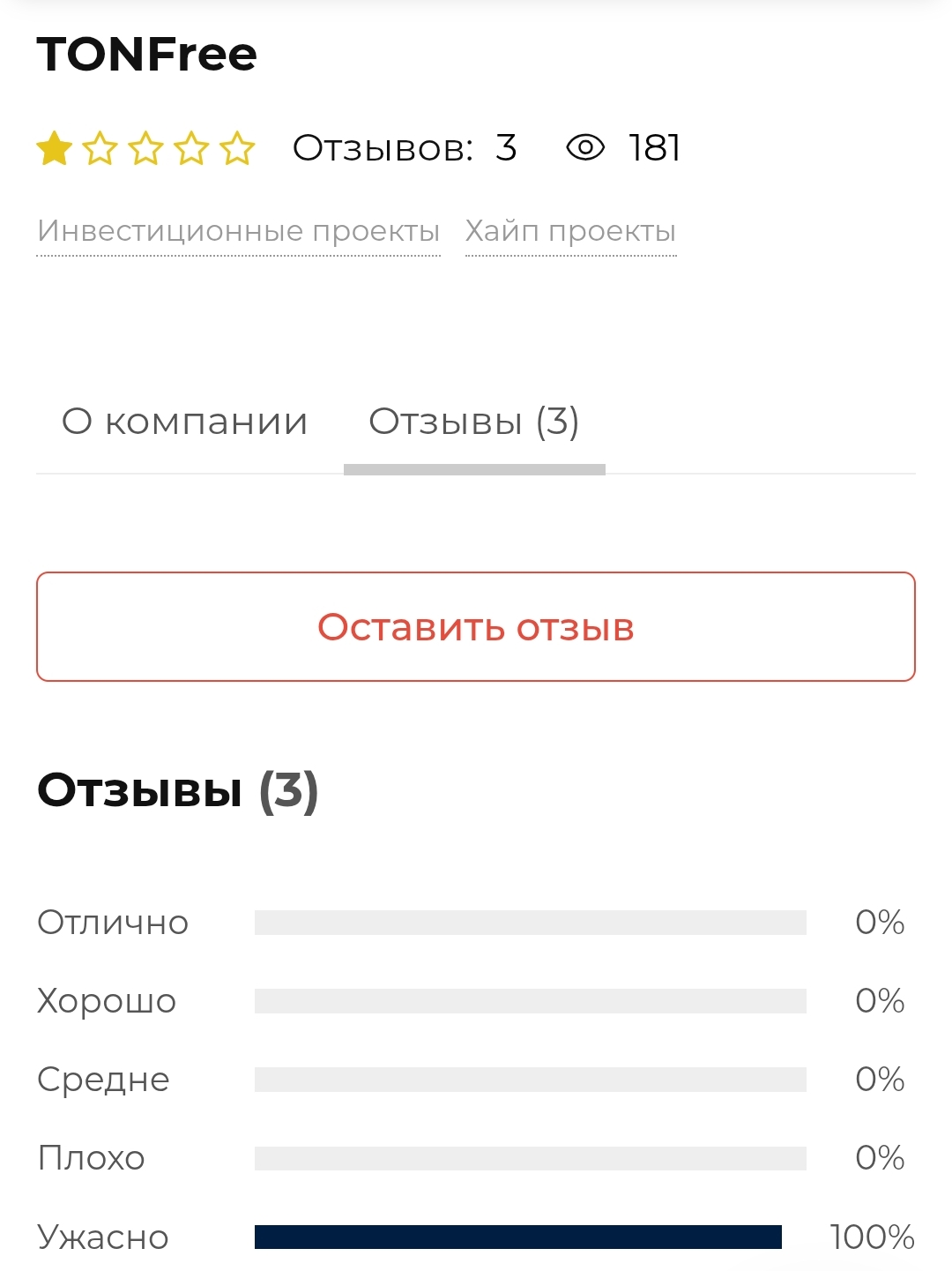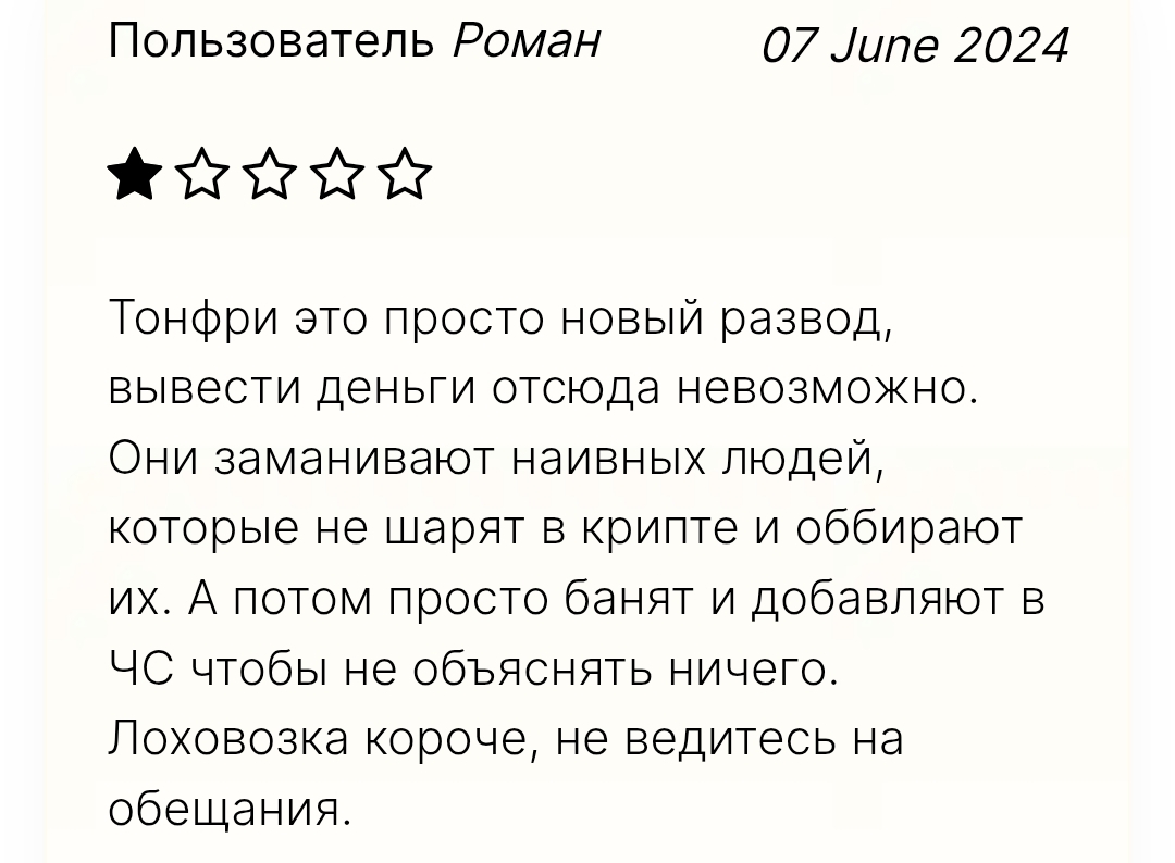У платформы Tonfree Win низкий уровень доверия, а отзывы пользователей о проекте носят исключительно негативный характер.