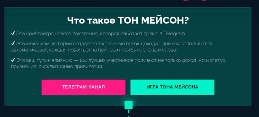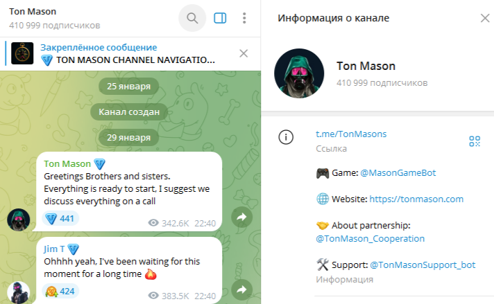 При этом на официальный телеграм-канал фирмы «Тон Масон» @ tonmasons подписано уже более 400 тысяч участников. Также в тг есть бот Ton Mason, где и расположен старт игры.