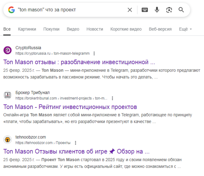 Дополнительно мы решили проверить информацию о данной организации в интернете. Но выяснилось, что реальной востребованности она не имеет. Проект Ton Mason Game в поисковике упоминается очень мало, плюс, отзывов в его адрес не видно.