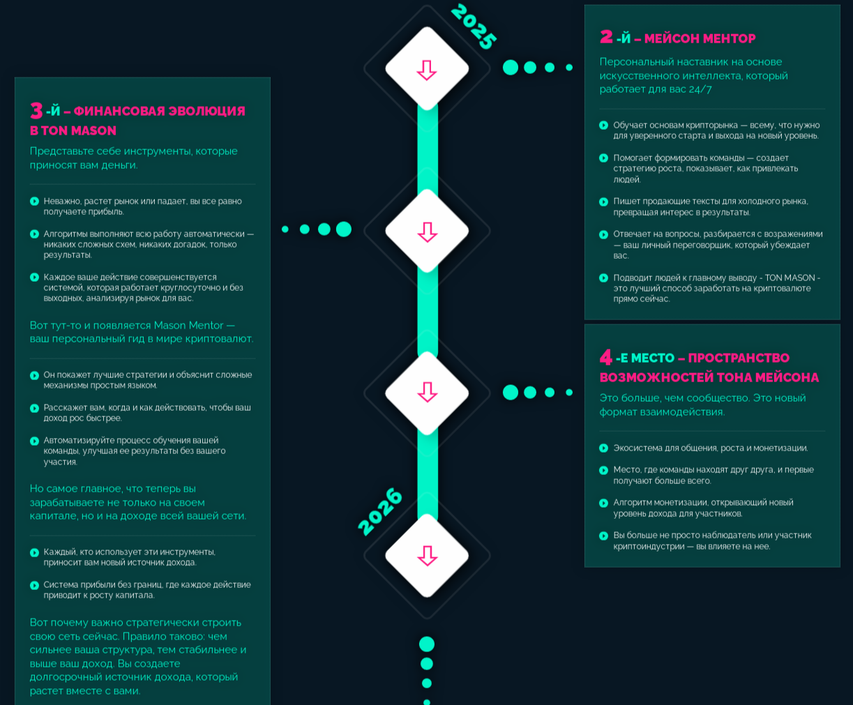 Как мы упомянули выше, на сайте организации была расположена дорожная карта. Судя по ней, 2025 года был разбит на 4 блока обновлений. Информация о первом этапе, к сожалению, уже недоступна.Что за короткое время было добавлено в проект Ton Mason Game в первую очередь – непонятно. Причем авторы и в своих социальных сетях не особо это расписывают. Исходя из этого, нет уверенности, что сейчас есть смысл присоединяться к их игре.