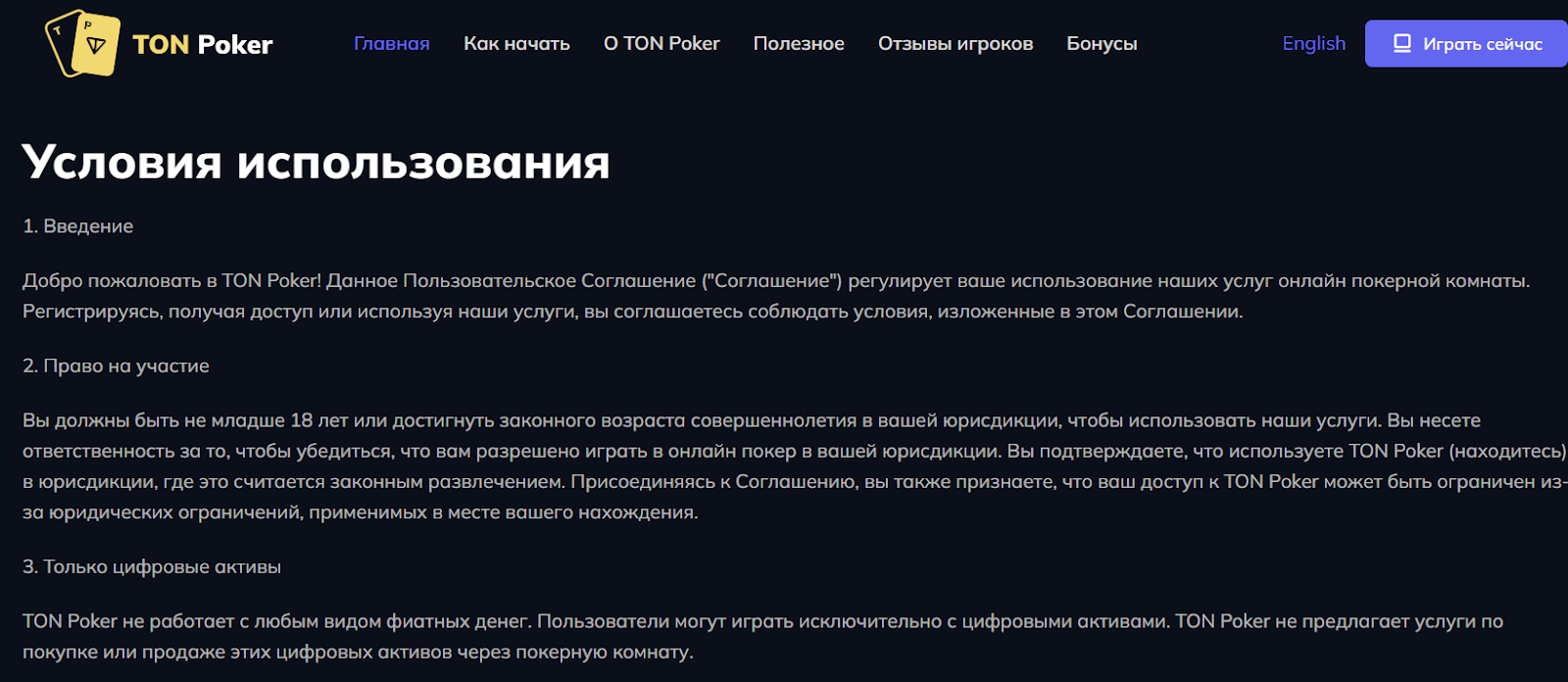 Также, столкнувшись с вопросом как вывести из «ТонПокер» деньги, игроки из России могут столкнутся с проблемами, поскольку доступ к игре запрещен в России Роскомнадзором. Кроме этого, обратившись к официальному сайту криптовалютной игры и сделав обзор покера Ton и его условий использования, можно найти пункт о том, что проект не работает ни с какими фиатными валютами.