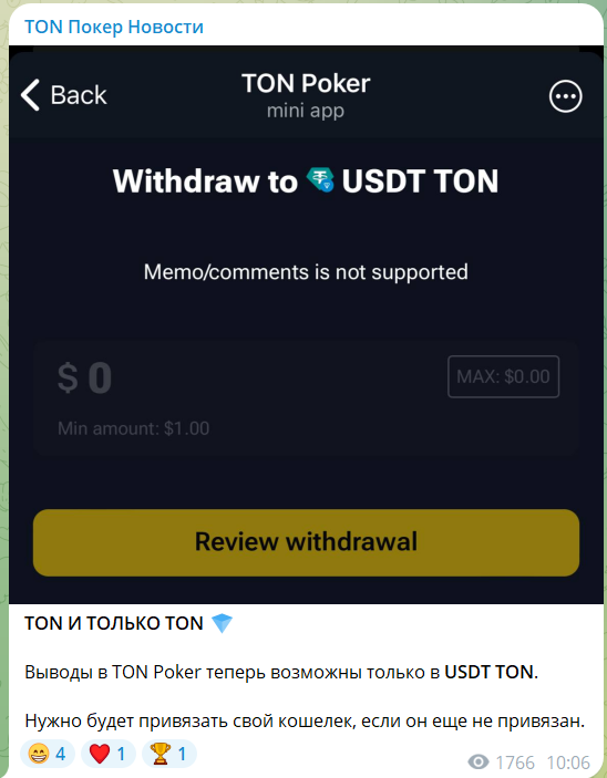 Вывод средств из Ton Poker доступен только на кошельки Ton Usdt. Ранее была возможность и альтернативных выводов, однако новые правила позволяют использовать лишь USDT Ton.
