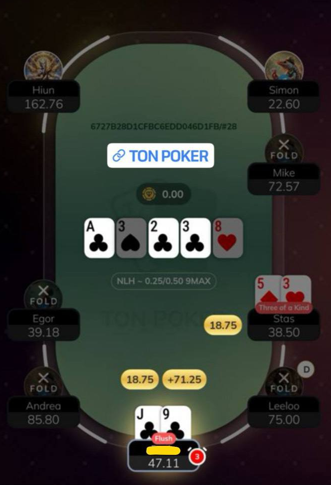 На март 2025 года это примерно 130 рублей. Сеть берет комиссию 0,05 Ton с пополнения, что около 13 рублей. После внесения открывается доступ в игровую комнату с другими пользователями TonPokerRoom. Игра представляет собой обычную партию в покер, где создавая аккаунты клиенты играют по обычным покерным правилам.