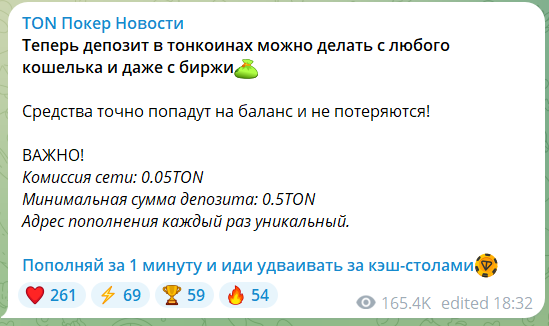На каналах есть инструкция как играть в Ton Poker – достаточно перевести криптовалюту на счет и открывается доступ к покерному столу, где есть возможность играть с другими игроками. Однако условия площадки для криптовалютной игры таковы, что минимальным внесением на депозит игры Ton Poker является 0,5 Ton.