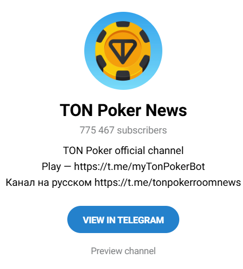 Несмотря на наличие официального сайта с возможность регистрации кошелька, основной ресурс платформы «ТонПокер» – Телеграм, где проект имеет более 775 467 подписчиков.