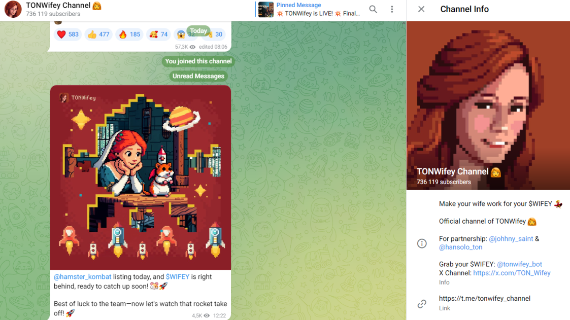 У проекта есть Телеграмм-канал TONWifey Channel, где публикуются изменения в игре. На него подписано более 763 тыс. людей.