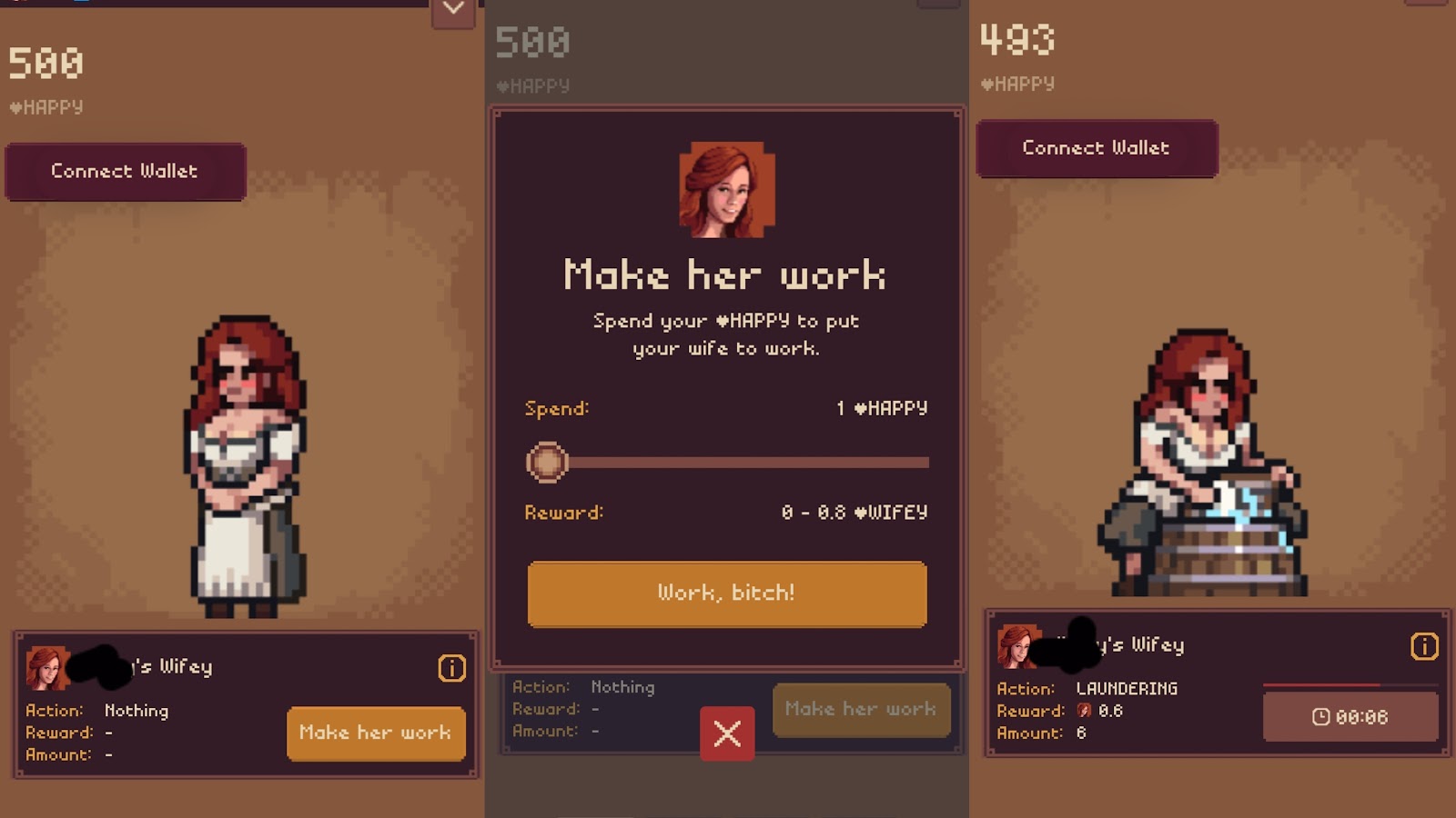 норм тема — заставляешь пиксельную жену пахать, пока сам как лох сидишь и кликаешь по экрану. Типа токены даёт. На деле — только мозги выносит и батарейку жрёт. Полнейшая дичь, не игра, а развод на терпение и время!