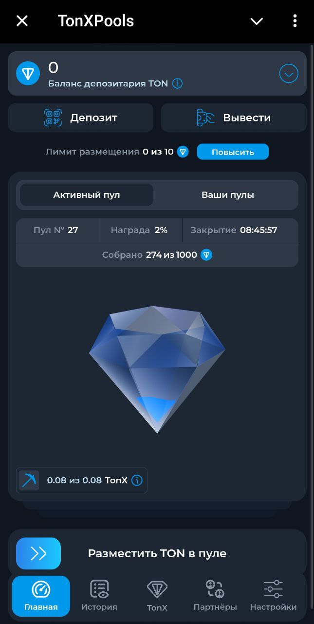 Для увеличения дохода можно разместить токены в депозитарии и участвовать в пулах для максимального продвижения и заработка. Пул ограничивается 10 “Ton”. Этот лимит можно увеличить, обменяв “TonX”. За это взимается комиссия 10%.