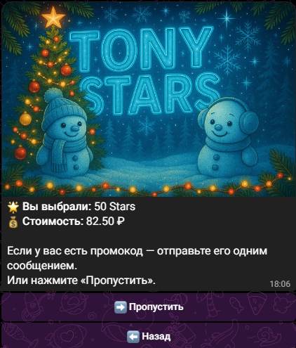 Telegram Stars, TON и Premium можно купить себе или подарить другу. Количество звезд можно указать любое. Например, 50 штук будет стоить ₽82.50. При наличии промокода Tony Stars bot его можно применить.
