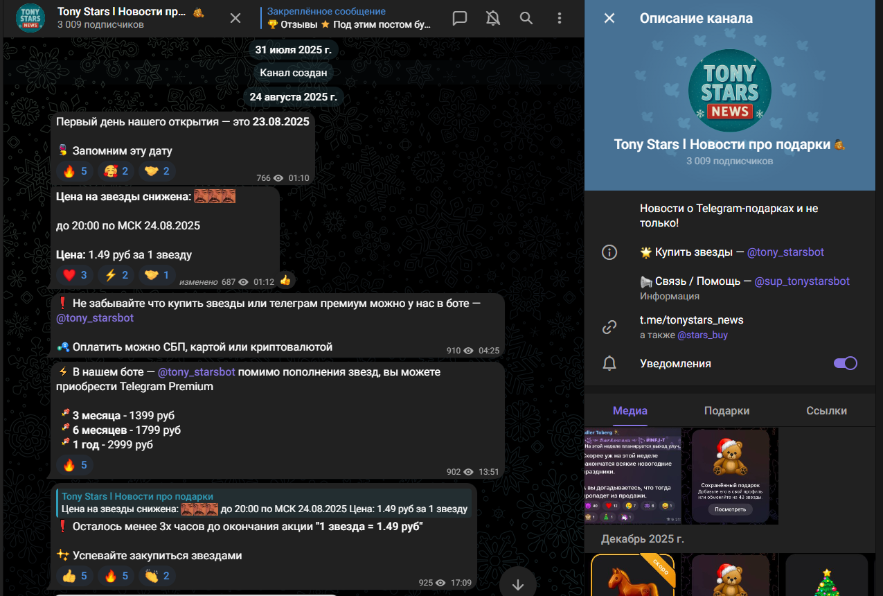 Tony Stars bot – сервис по покупке Telegram Stars, TON и Premium якобы дешевле, чем в приложении, и без верификации. В обзоре проанализируем доступный функционал, посты публичного телеграмм-канала, а также отзывы клиентов «Тони Старс».