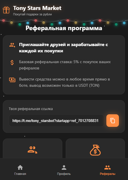 Tony Starsbot позволяет покупать подарки через внутреннее приложение. Маркетплейс позволяет сортировать каталог по фону, модели, символу и другим параметрам. Здесь же можно зарабатывать на привлеченных рефералов – 5% с каждой их покупки. Вывести прибыль можно якобы в любой момент, но только в TON. Программа не конвертирует валюты.
