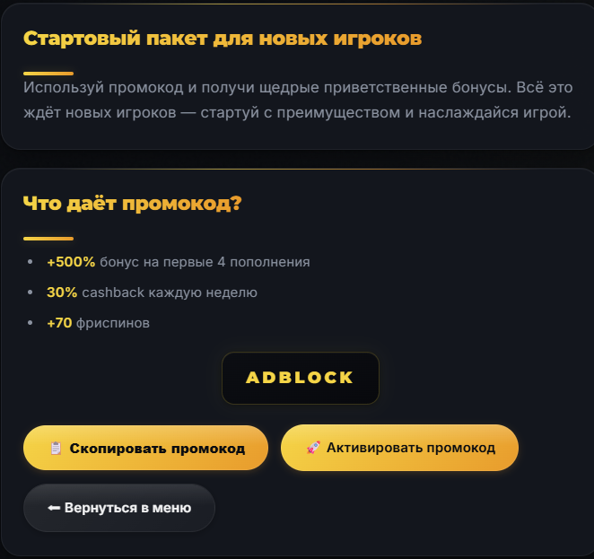 По определенному промокоду новым пользователям обещают бонусы: +500% на первые 4 пополнения, +70 фриспинов и 30% кэшбэка каждую неделю.
