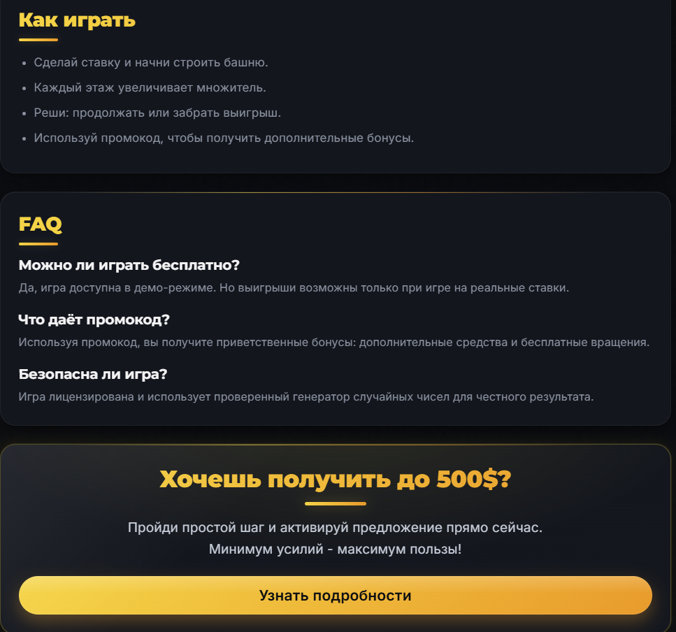 Ниже приведена дополнительная информация, согласно которой бесплатная игра возможно только на демо-счете. Выходит, Товер Русх требует вложений. В начале каждой попытки юзеру необходимо сделать ставку: она может окупиться или, наоборот, быть потеряна в зависимости от размера построенной башни. Четкая корреляция между прогрессом и прибылью нигде не обозначена, что очень подозрительно.