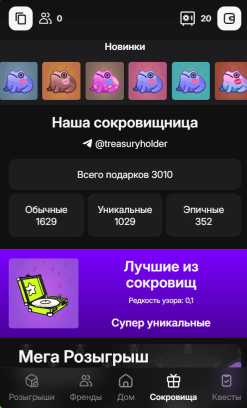 - Сокровища. При рассмотрении секретов, как играть в игру Treasury, важно обязательно заскочить в раздел. В сокровищнице можно найти большой выбор жабок, которые отличаются владельцем, моделью, фоном, узором и количеством. Здесь же можно посмотреть количество обычных, уникальных и эпичных подарков бота Treasury в ТГ.