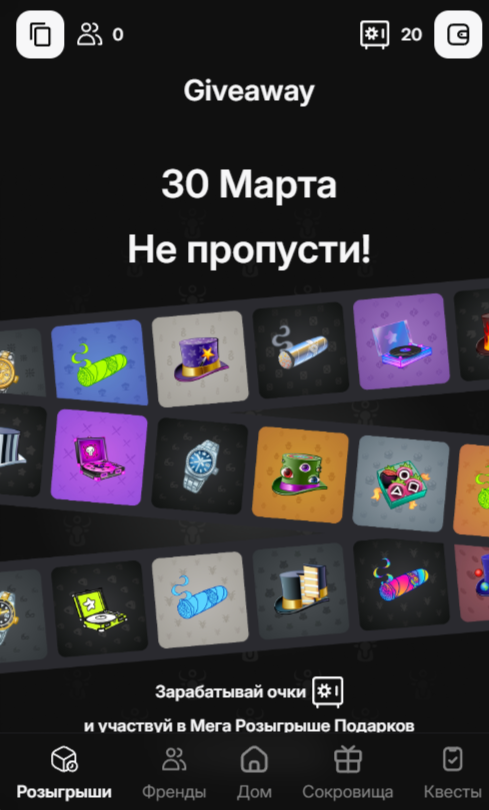 - Розыгрыши. Здесь разработчики анонсируют запуск конкурса для получения бесплатных монеток и очков. Участникам предлагают подключиться к проекту 30 марта 2025-го и стать участником некоего подобия airdrop.