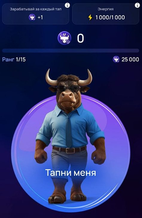 Игра представляет собой обычную тапалку, которая ничем не отличается от огромного количества идентичных проектов. Можно просто открыть приложение в Телеграм, тапать по бычку на Главной и зарабатывать токены UBT за каждый клик. Их можно тратить на повышение ранга и апгрейды, которые увеличивают доход с клика и максимальный запас энергии, а кроме того, дают дополнительные бонусы. Ускорить прогресс можно путем выполнения требований по собранному количеству токенов и приглашенных в игру друзей.