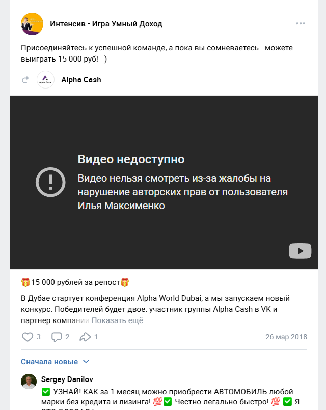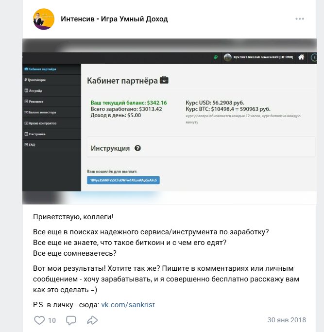 Более того Николай делится ссылкой сайт, партнером которого якобы является. Он оставляет информацию о высоком заработке и приглашает пользователей присоединиться к нему. На апрель 2026 года рекламируемый сайт «Интенсив – Игра Умный Доход» заблокирован и удален, в группе в ВК больше не выкладываются записи на стене.Скорее всего основатели забыли о данном проекте, либо получили то, что хотели от него и забросили.