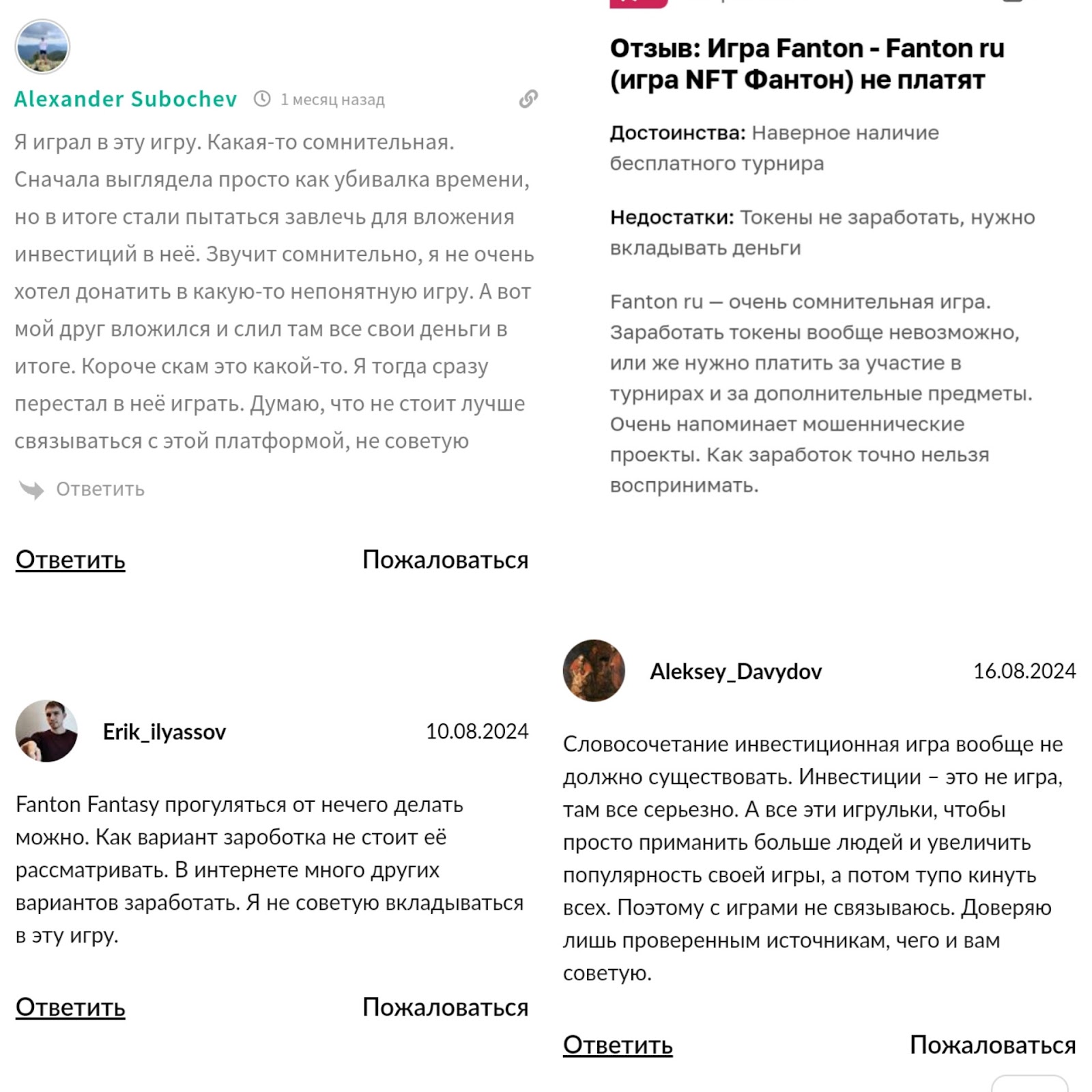 В Телеграмме открыто комментирование, однако под публикациями нет конкретных отзывов о канале Vadim Sterlin in TON. На просторах интернета есть разные отклики о проекте Вадима Fanton Fantasy Football. Есть положительные, в которых видят перспективы игры. Однако встречаются отрицательные комментарии о том, что зарабатывать токены удается с трудом.