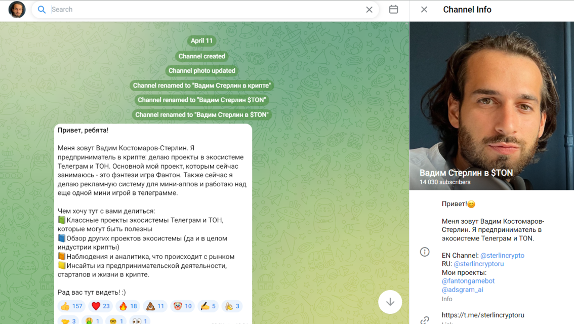 Ознакомиться с деятельностью автора можно с помощью Телеграмма Вадим Стерлин в Ton. Паблик Sterlincryptoru начал работу 11 апреля 2024 года. Сейчас на него подписано 14 тысяч пользователей. Просмотры публикаций даже превышают количество подписчиков. Это означает, что люди заинтересованы в опубликованном контенте. Исходя из ознакомительного поста, Вадим Костомаров Стерлин создает проекты в Телеграмме и сети ТОН. Ознакомился с криптовалютой автор в 2020 году.
