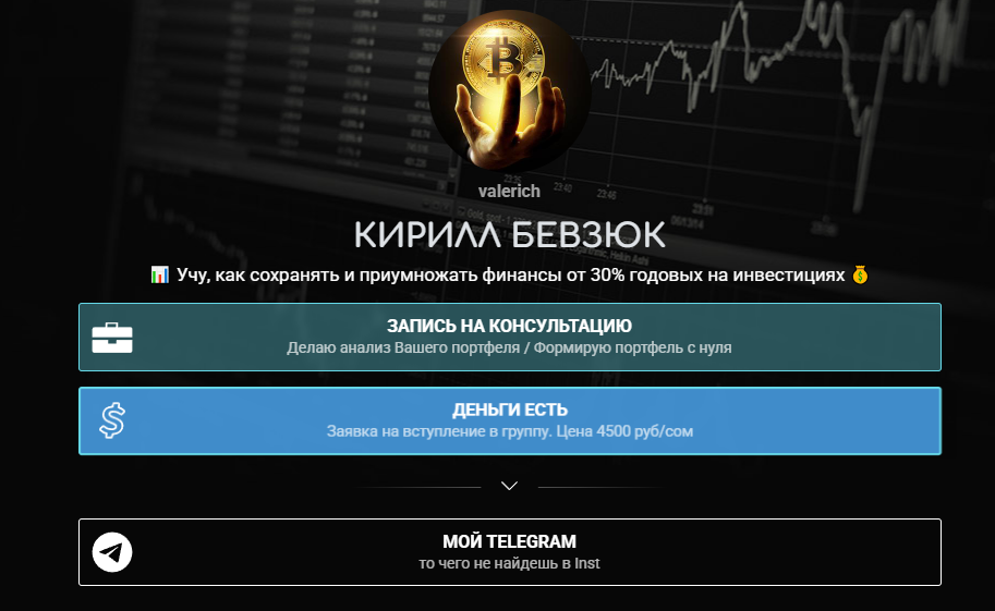 Инвестор «Валерич» запустил телеграмм-канал Kirillbevzuk 1 марта 2024 года и сразу начал продвигать себя как эксперта по криптовалютам. На странице Taplink до сих пор висит обещание научить сохранять и приумножать деньги от 30% годовых на инвестициях, хотя автор давно забросил эту тему.