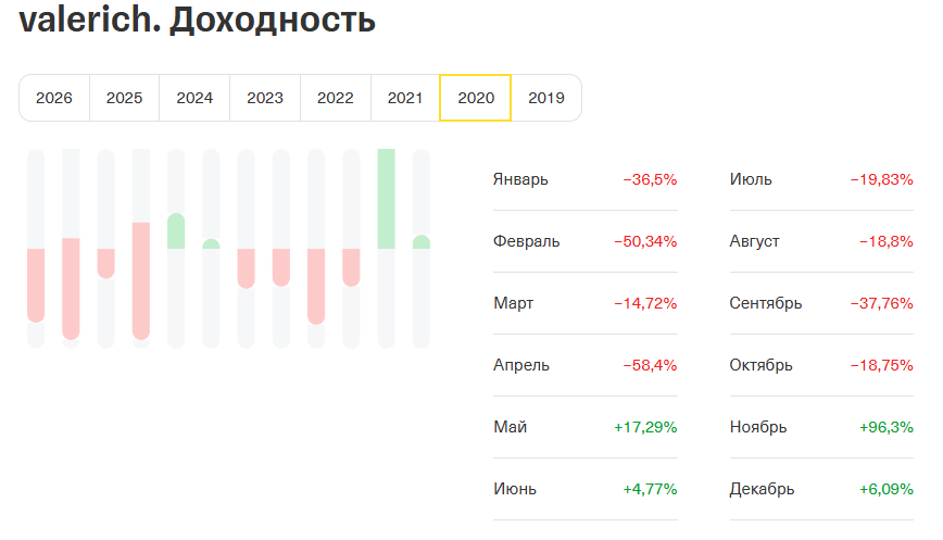 У инвестора был публичный портфель в «Т-Банке» со статистикой за период 2020–2023 годов, и она совсем не впечатляет. Статистика показывает постоянные убытки с просадками до 88% за месяц, а в 2023 году торговля практически прекратилась.