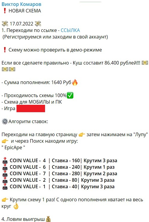 Контент канала состоял из постов с комбинациями ставок, по которым якобы можно было достигнуть 100% проходимости. Суть схемы сводилась в том, чтобы выбрать указанную игру, и делать ставки определенного размера определенное количество раз.