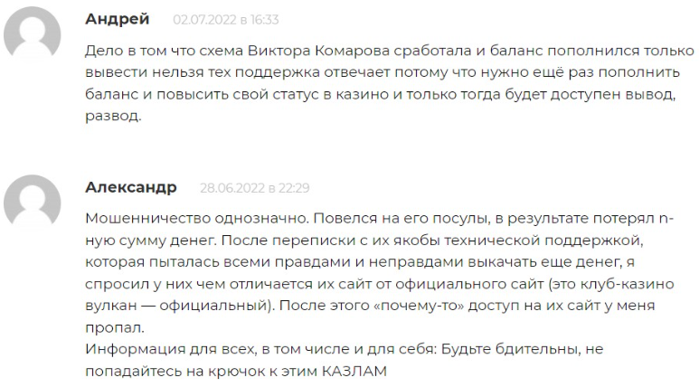 В интернете есть несколько отзывов о Викторе Комарове, все они негативные. Подписчики сообщают, что их разводили на деньги, заманив возможностью делать легкую прибыль.