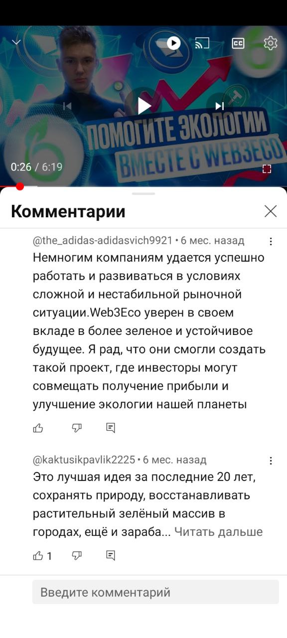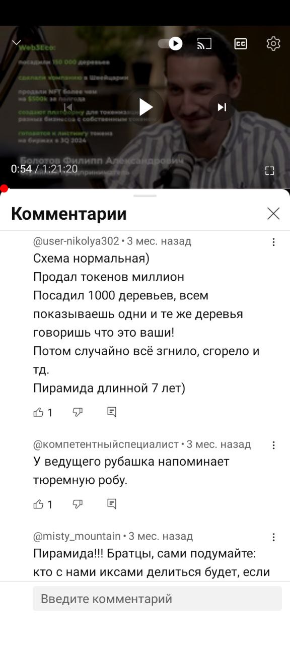 В сообществе Web3Eco на странице «Вконтакте» комментарии открыты, но там никто ничего не пишет. На «Ютубе» есть много роликов про Web3Eco и интервью с Филиппом Болотовым.
